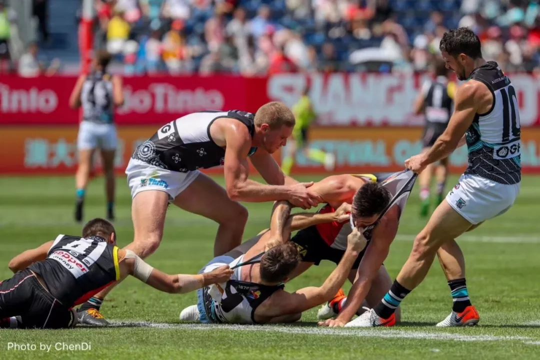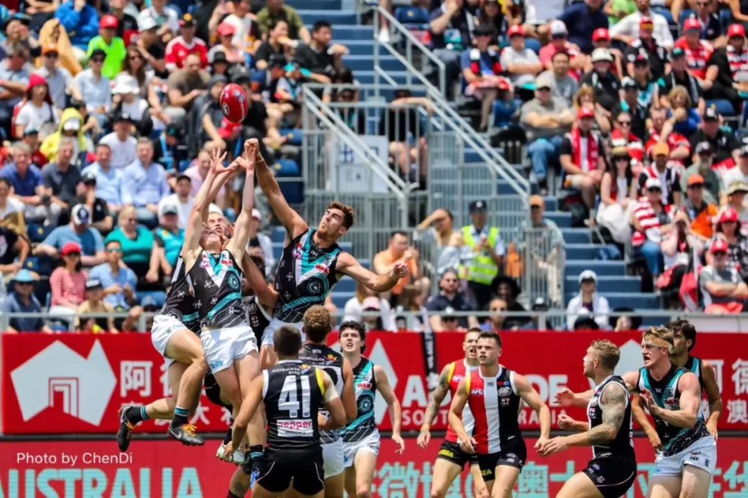 2019澳式橄欖球超級聯(lián)賽(AFL)上海站于6月2日在江灣體育場火熱開賽。比賽當(dāng)天,在澳洲原住民表演的戰(zhàn)舞和中國風(fēng)的舞龍舞獅表演之后,雖然戶外溫度高達(dá)35°C,但絲毫沒有影響澳洲老牌勁旅37次冠軍獎得主阿德萊德港力量隊與同樣實力超群的墨爾本圣基爾達(dá)圣徒隊展開激烈的對決。連續(xù)三年來到上海的阿德萊德港力量隊坐鎮(zhèn)“主場”,最終以139比69大勝墨爾本圣基爾達(dá)圣徒隊,并在積分榜上躋身前八。