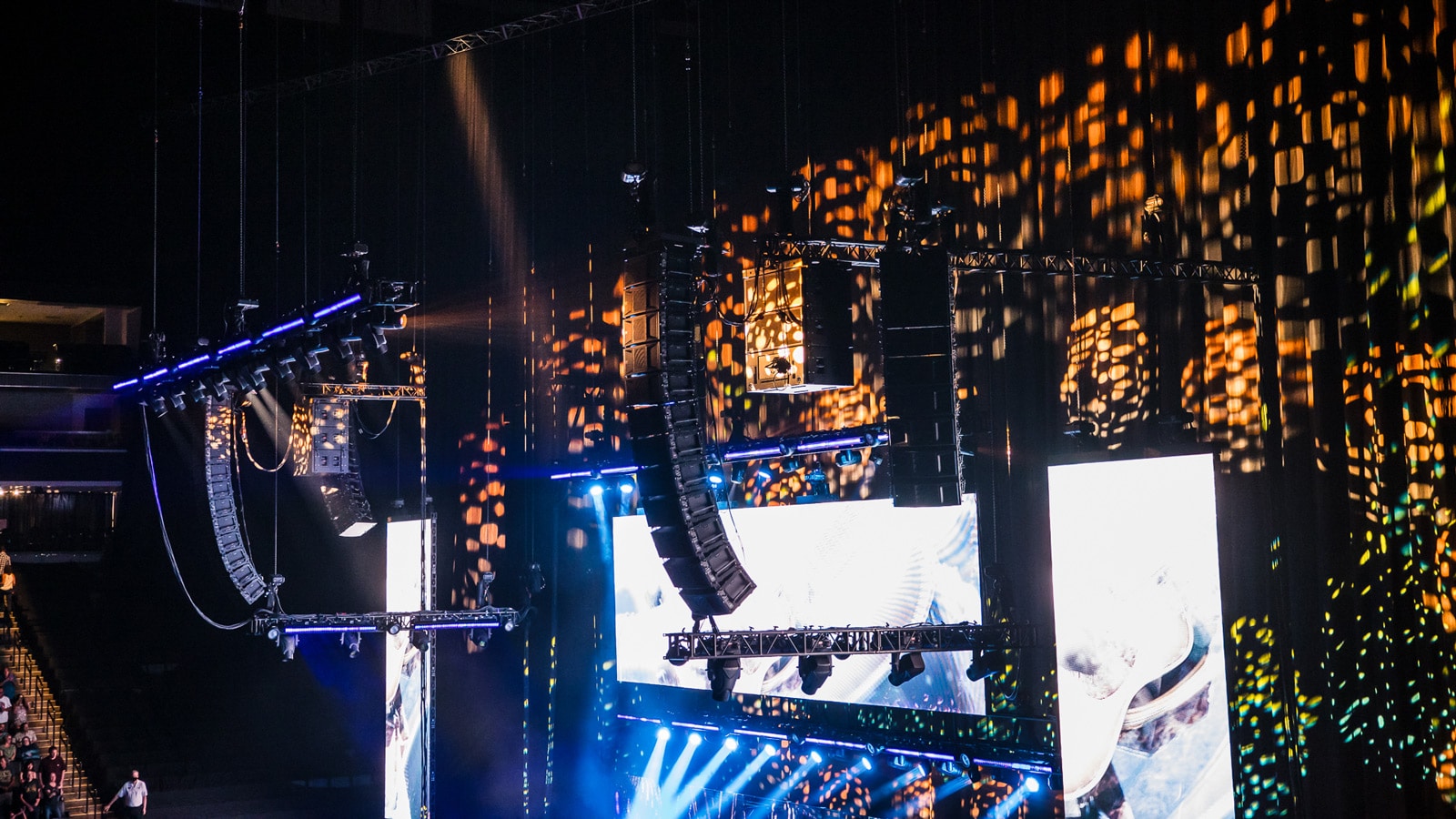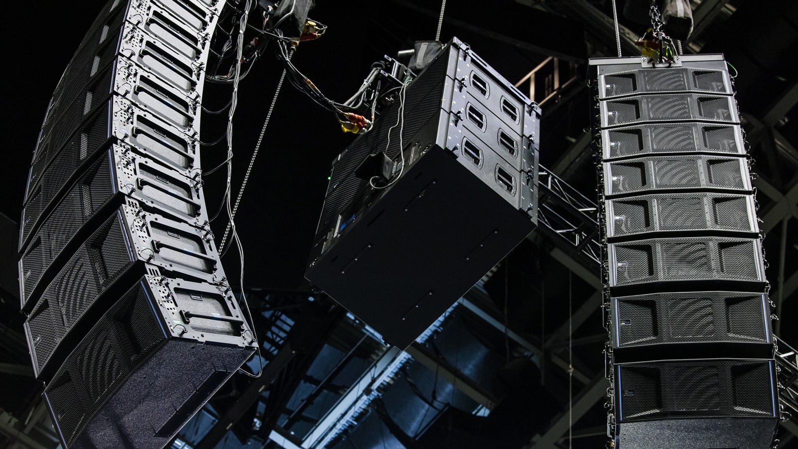 巡演采用了典型的體育場擴(kuò)聲系統(tǒng)配置,主擴(kuò)左右兩組陣列每組各由 12 只 PANTHER 線陣列音箱組成,搭配 12 只 1100-LFC 低頻控制單元增強低音。此外,側(cè)補聲陣列也采用了 PANTHER 音箱。