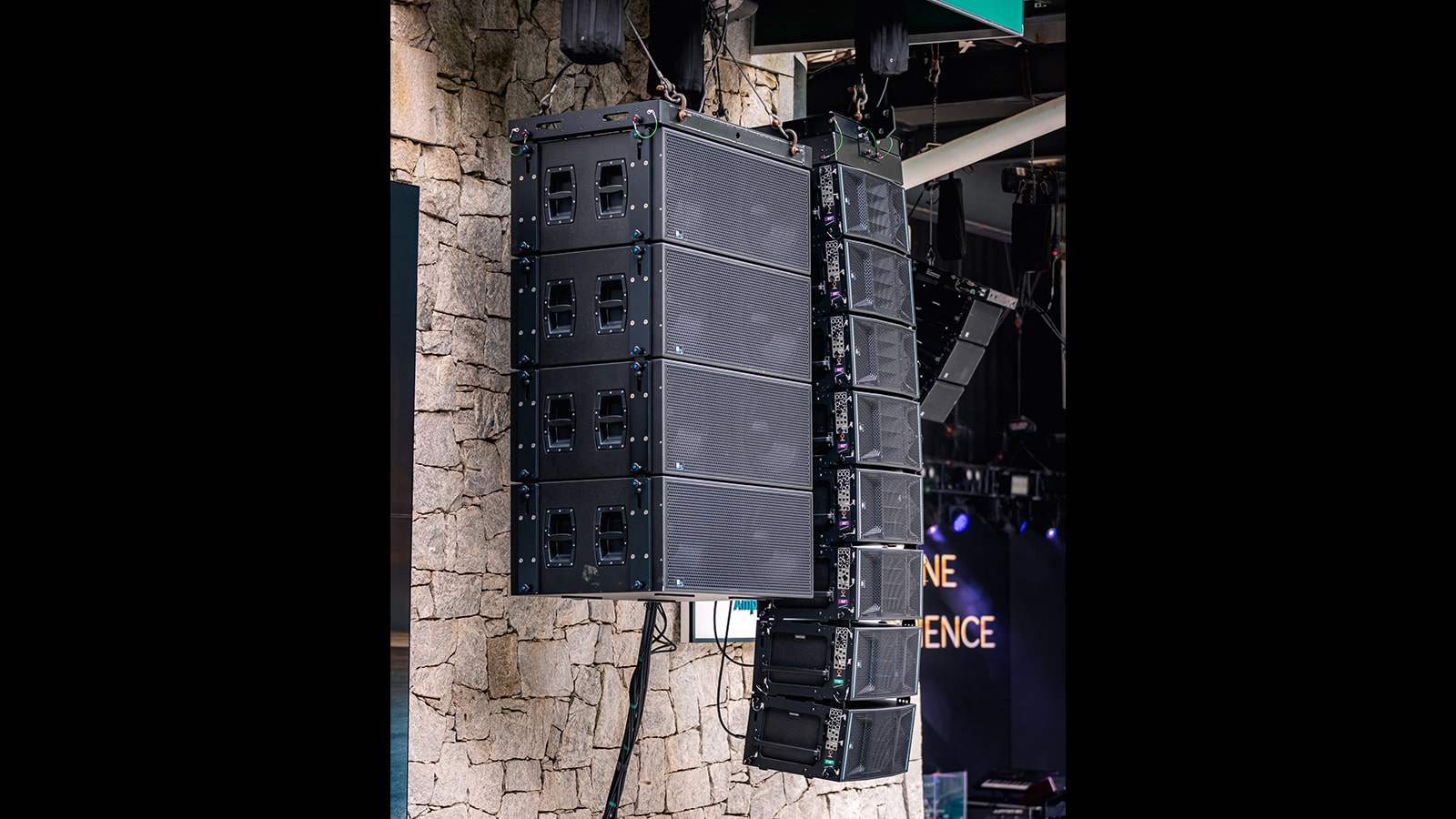Cadence 銀行露天劇場擴聲系統(tǒng)主擴由左右兩組吊掛的 PANTHER 組成,每組各 8 只,同時兩側(cè)還各配置了 2 只 LEOPARD 緊湊型線陣列音箱。另吊掛兩組較短的 LEOPARD 陣列——每組 3 只,用于覆蓋中央觀眾區(qū),外加 4 只 LEOPARD 用于舞臺唇補。此外,左右兩側(cè)各吊掛 4 只 1100-LFC 低頻控制單元用于增強低音效果。整套擴聲系統(tǒng)由 2 臺 Meyer Sound Galileo GALAXY 816 網(wǎng)絡(luò)平臺處理器通過 Milan AVB 協(xié)議驅(qū)動和處理。