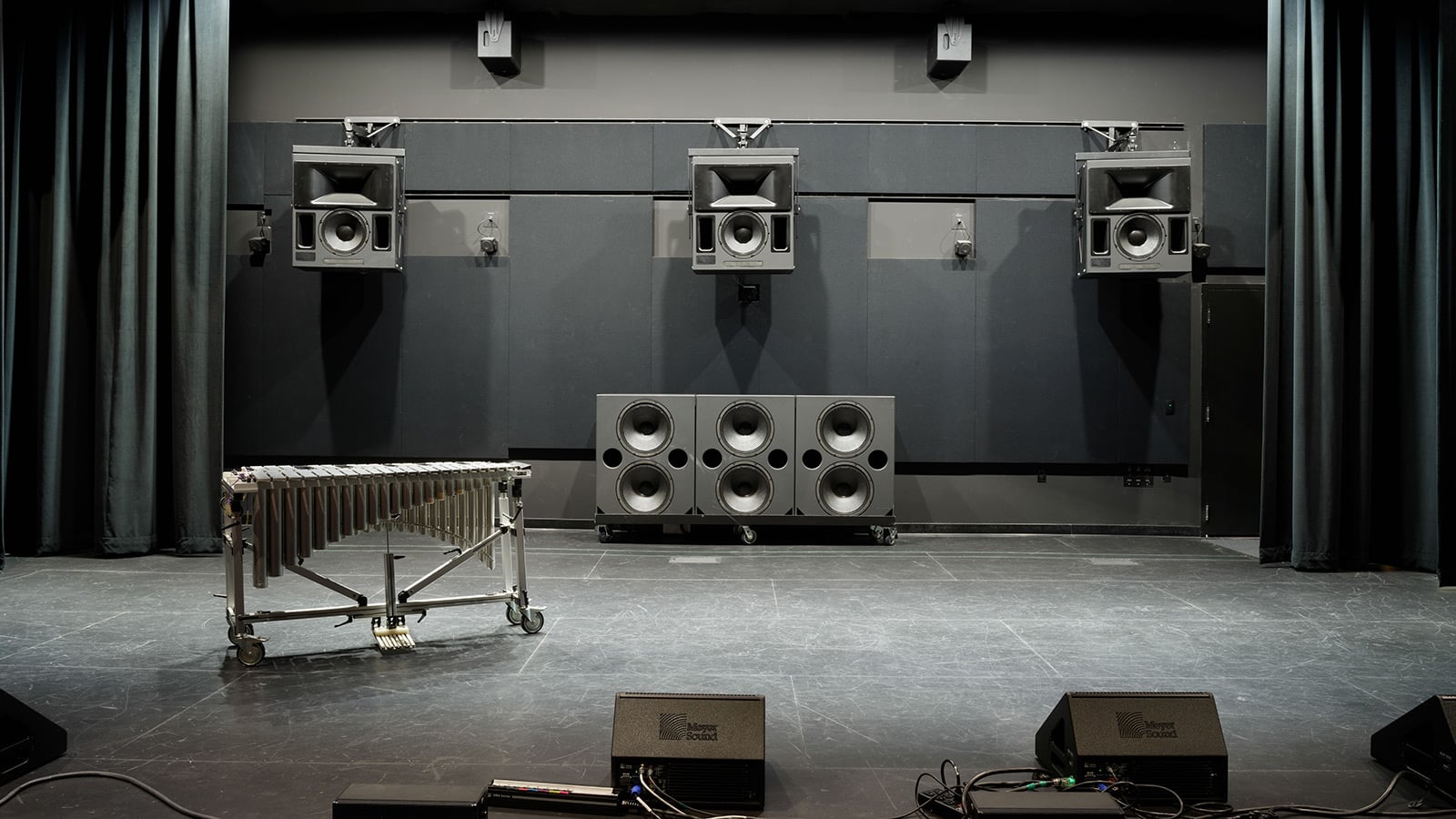 Raisbeck 禮堂的系統(tǒng)一共由 110 只 Meyer Sound 音箱組成,呈 4 套子系統(tǒng)配置。Constellation 系統(tǒng)和支持杜比全景聲(Atmos)功能的影院沉浸聲系統(tǒng)由 70 只小型全頻音箱(Ashby-8C, HMS-5, MM-4XP)和 16 只 MM-10XP 超低頻音箱組成,空間四周排列配置了 64 只電容話筒,用于環(huán)境聲學(xué)感應(yīng)。主擴(kuò)系統(tǒng)采用了 6 只 UP-4slim 和 3 只 ULTRA-X40 音箱,另配置 3 只吊掛的 USW-210P 超低頻音箱組成中置心形陣列以增強(qiáng)低音效果。屏幕通道采用了 3 只 Acheron 80 影院音箱,而 LFE 通道則配置了 3 只 X-800C 影院超低頻音箱,另配置 6 只 MJF-208 舞臺監(jiān)聽音箱用作藝人返送系統(tǒng)。