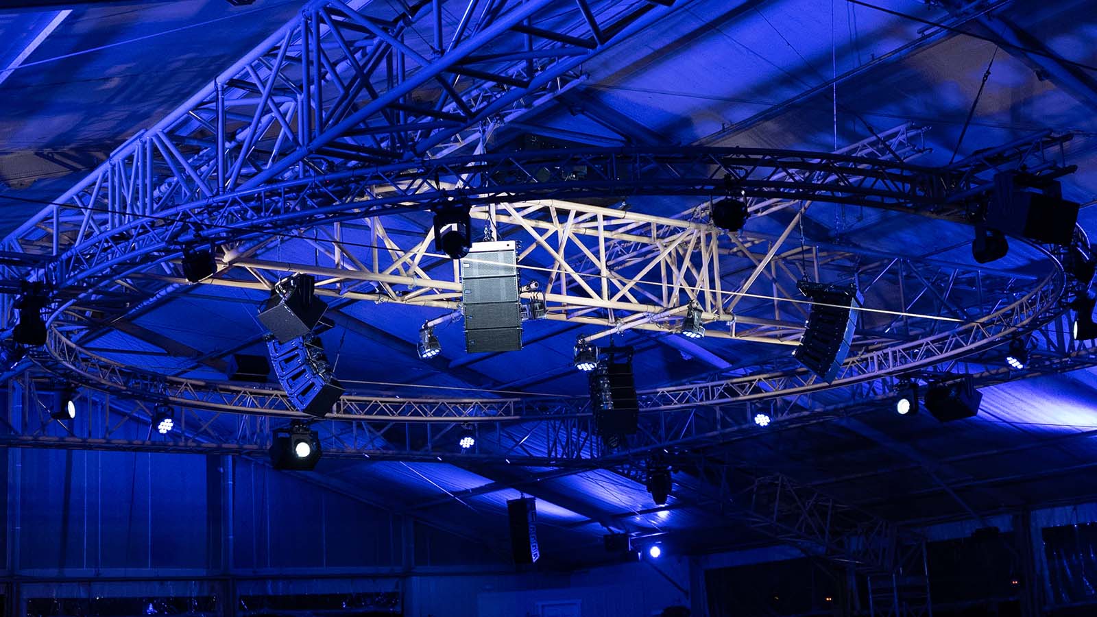 安裝完畢后,中央環(huán)形主舞臺(tái)系統(tǒng)由 16 只吊掛的 LINA 緊湊型線陣列音箱組成,呈4 組分布,每組 4 只,外加 4 只 ULTRA-X40 用于補(bǔ)聲和 1 只 1100-LFC 低頻音箱用以提供雷鳴般的強(qiáng)勁低音。