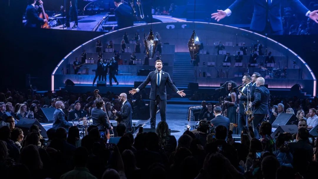 這一次的新功能是引入了 Spacemap Go 空間音頻設(shè)計和現(xiàn)場混音工具,當 Michael Bublé在兩個舞臺之間漫步時,它可以平滑透明地跟蹤 Bublé 的聲音,在所有座位上保持精確的聽覺定位,并在多個揚聲器陣列中進行同步,逐級改變電平和延遲。