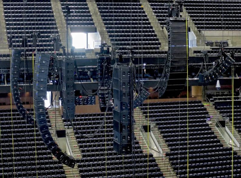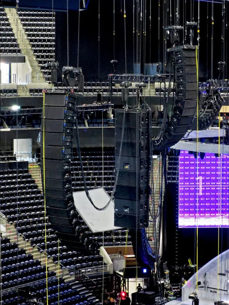 四個主舞臺陣列總共部署了 60 個 LEO 和 LYON 線陣列揚聲器以及 12 個 1100?LFC 和四個 900?LFC 低頻控制元件。前臺補聲是八個 MINA 和兩個 JM?1P 揚聲器。