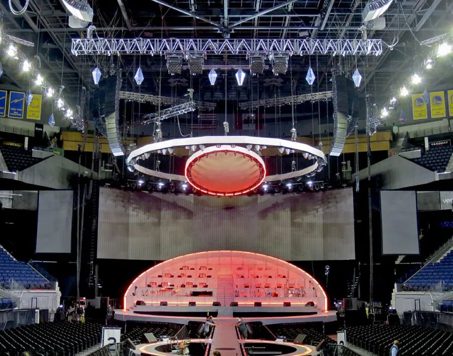 “Michael Bublé之夜”的北美巡演于 8 月恢復(fù),到 10 月下旬,在A級競技場上舉辦了 23 場演出,吸引了眾多粉絲。巡演一如既往地由全球知名的制作公司 Solotech 提供Meyer Sound 擴聲系統(tǒng),并且這個龐大的系統(tǒng)再次部署在一種新穎的“雙混合”配置中,包括典型的后級陣列和在B舞臺作為基本功能的中央吊掛陣列組成一個全面的系統(tǒng)。