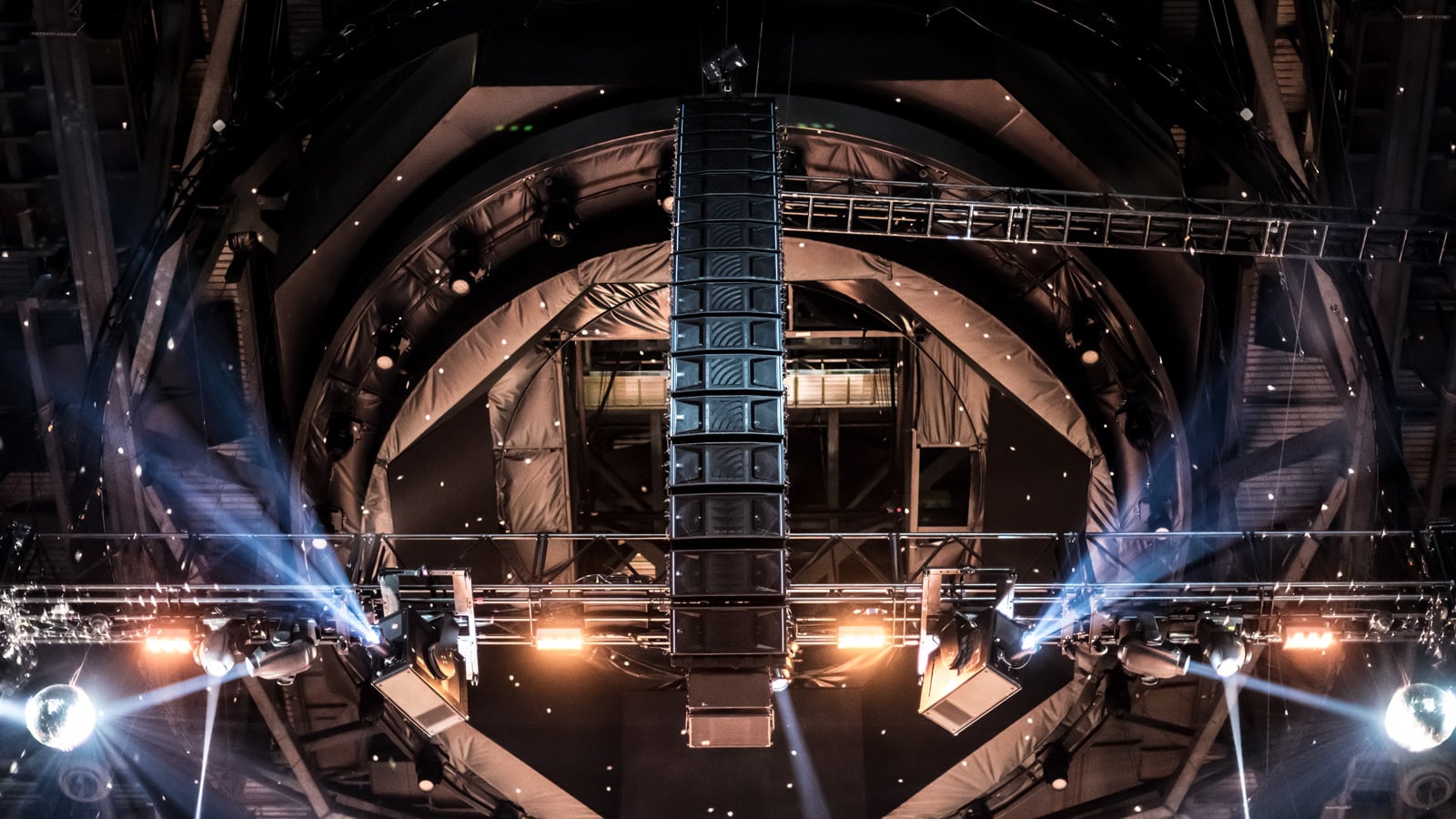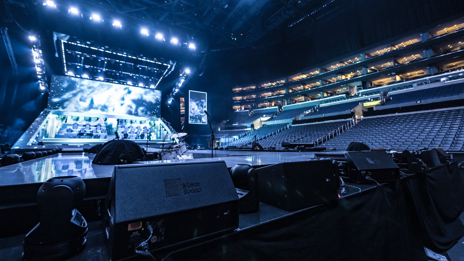 主舞臺(tái)系統(tǒng)由兩組前置主擴(kuò)陣列組成,每組下部分為 4 只 LEOPARD,上部分為 14 只 PANTHER。左右兩組側(cè)補(bǔ)聲陣列每組各 14 只 LYON 音箱,前置補(bǔ)聲則為 8 只 ULTRA-X40 音箱。另配置兩組吊掛的陣列用來增強(qiáng)低音,每組各 6 只 1100-LFC 低頻控制單元,外加置于地面上的 4 只 900-LFC 用于補(bǔ)充低音效果。