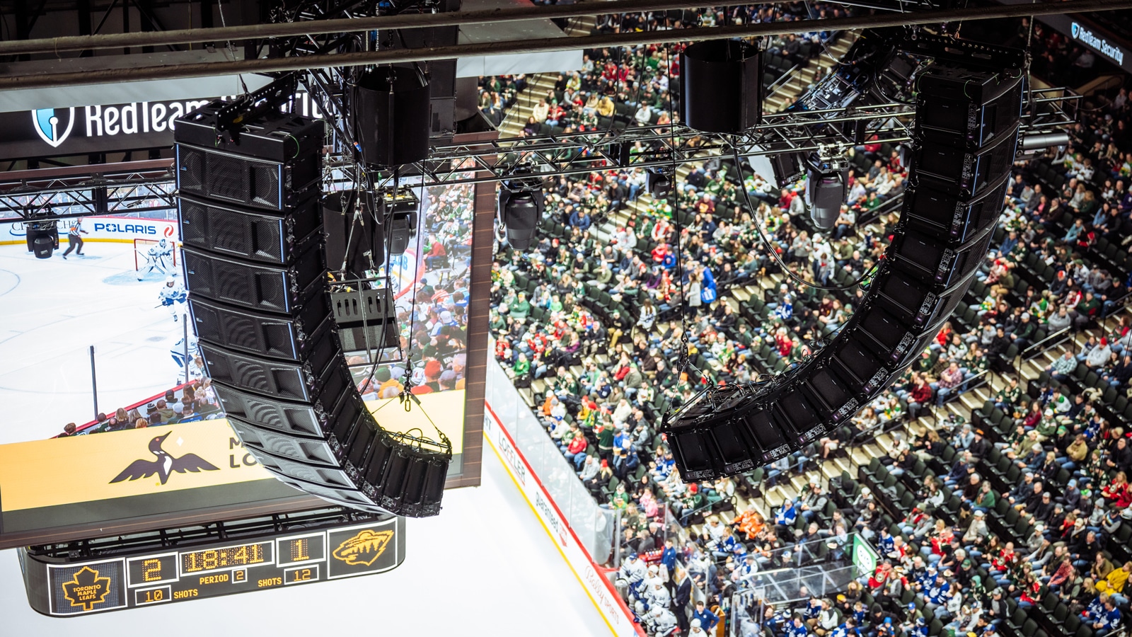 在 2022 年春天資金到位時,管理層要求 Pfitzinger 快速找到一套能匹敵其他任一冰球聯(lián)盟球隊場地或質(zhì)量更優(yōu)的全新且先進的擴聲系統(tǒng)。在行業(yè)供應(yīng)緊張的情況下,Pfitzinger 迅速與 Sound Associates 公司的 Domonic Sack 就可選的方案進行了磋商。時間緊迫,許多制造商都不能承諾在短時間內(nèi)交付我們青睞的產(chǎn)品,而 Meyer Sound 能夠?qū)⒒囊瓣犞鲌鱿到y(tǒng)升級項目納入其生產(chǎn)計劃。在短短 11 天內(nèi),整個系統(tǒng)就完成了布線、吊掛和調(diào)試工作,正好趕上明尼蘇達荒野隊使用新系統(tǒng)的首場比賽。