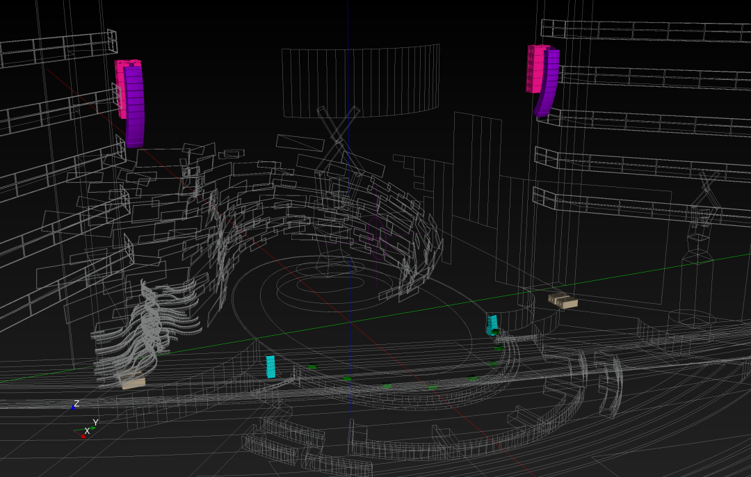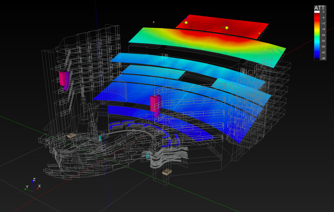 根據(jù)湖南衛(wèi)視七彩盒子的建筑及金鷹節(jié)閉幕式的舞美布局,廣遠(yuǎn)團(tuán)隊(duì)使用MAPP3D軟件對場地進(jìn)行建模,針對閉幕式擴(kuò)聲系統(tǒng)進(jìn)行設(shè)計(jì)。