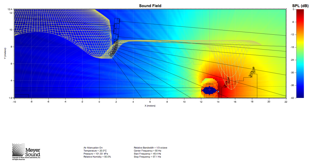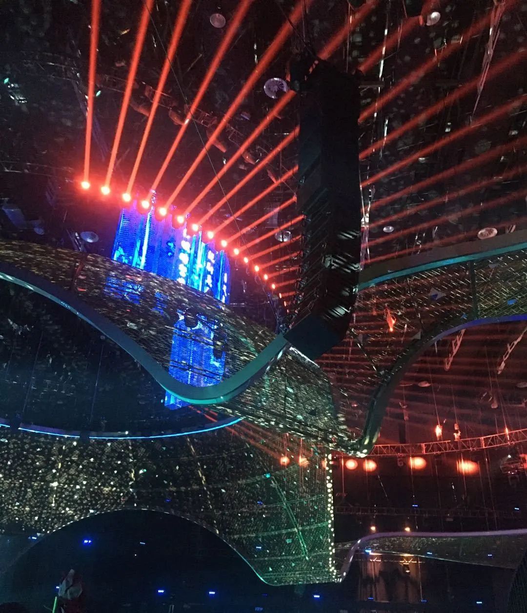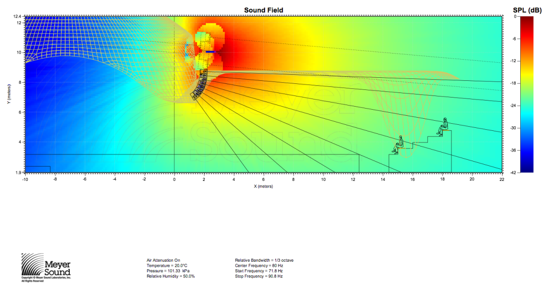 在設(shè)備進場后,為了使導(dǎo)師位置低音更加震撼,增加了4只1100-LFC組成的超低頻心型指向性陣列。超低頻陣列的指向性控制使該陣列的能量集中在導(dǎo)師位置附近,也不會給觀眾區(qū)過多的低音沖擊。