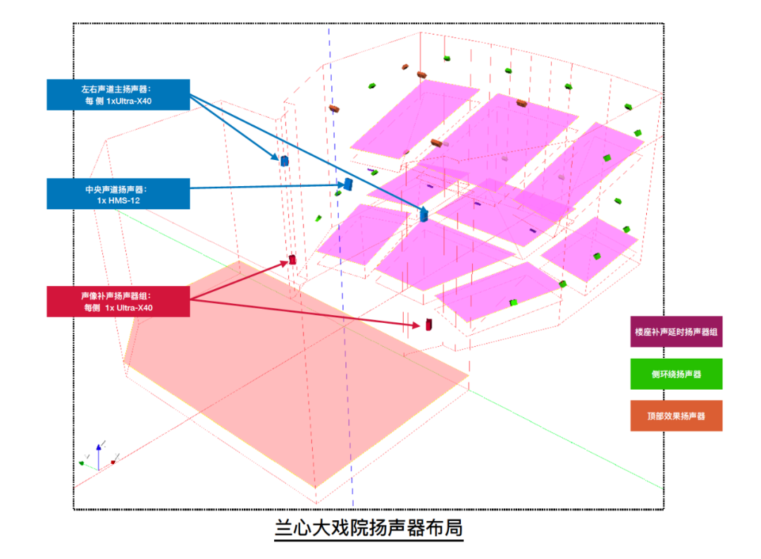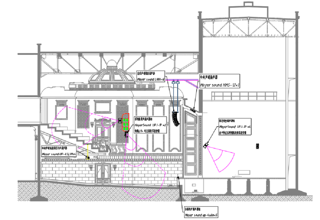 中央聲道采用1只Meyer sound HMS-12獨(dú)立覆蓋池座及樓座全場(chǎng)觀眾區(qū)域,從而實(shí)現(xiàn)為全場(chǎng)提供清晰的語(yǔ)音擴(kuò)聲。左右聲道各采用1只Meyer Sound Ultra-X40緊湊型寬覆蓋揚(yáng)聲器,完整覆蓋池座及樓座全場(chǎng)觀眾區(qū)域。